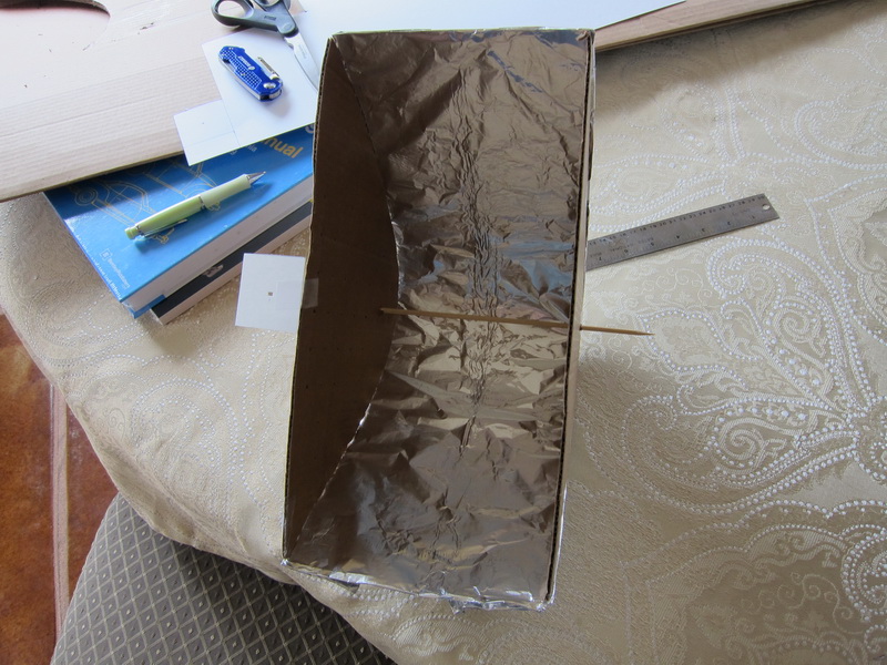 Remember the small hole we put in the cardboard at the focal point of the parabola? Now it is time put push the wooden skewer through that small hole. Be careful though. We have to get a hotdog on here too. Push the skewer through the first hole in your oven.. Be careful that the tape on the reflector doesn’t come undone. You need to be gentle. The oven is delicate!